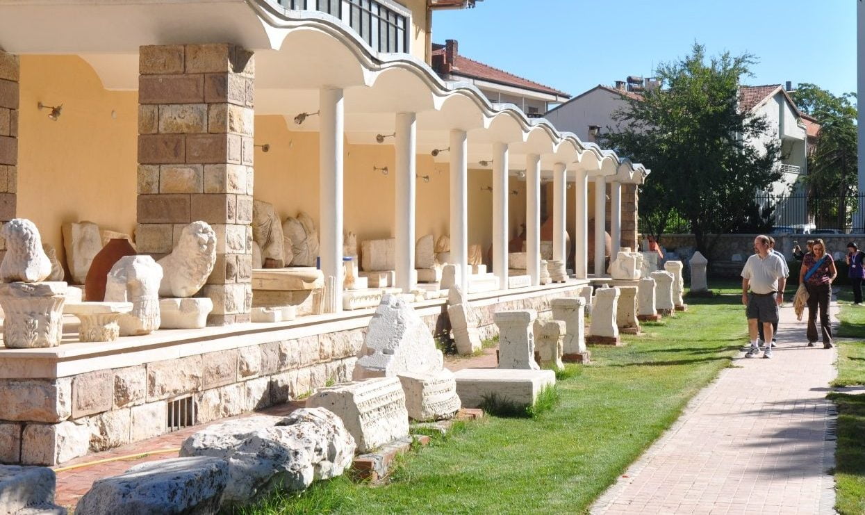 The sacred precinct of the acropolis, the city`s highest point, contains a temple dedicated to Emperor Augustus. Originally a temple to the goddess Kybele was located here. It was replaced by a temple dedicated to the moon-god Men afterwards. Still later, an elaborately decorated Augustus temple, dedicated to the Emperor who established the first and biggest Roman colony in the area, was built on the site in the late 1st century BC. From the standpoint of both its architecture and its decoration, the Temple of Augustus is a unique example of its kind. In the early 5th century, the temple was converted into a Christian church.